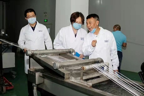 朱美芳(中)在生产一线指导交流制备抗菌功能母粒。久久久久国产成人精品亚洲综合供图