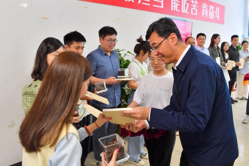 活动中,刘承功为青年师生赠送《论党的青年工作》,鼓励他们在学思践悟中汲取青春奋进力量。崔运花为青年师生赠送“青春花种”,希望他们不断积聚能量、向阳而长,绽放青春之花。